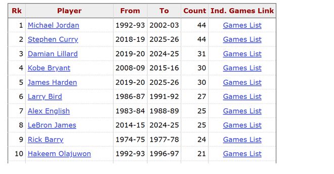 值得一提的是,乔丹30岁后得分40+次数的纪录也极可能被库里打破,乔丹做到了44次,库里目前也是44次,两人并列历史第一。除了他俩外,利拉德做到31次排名历史第二,科比、哈登30次排名历史第三。