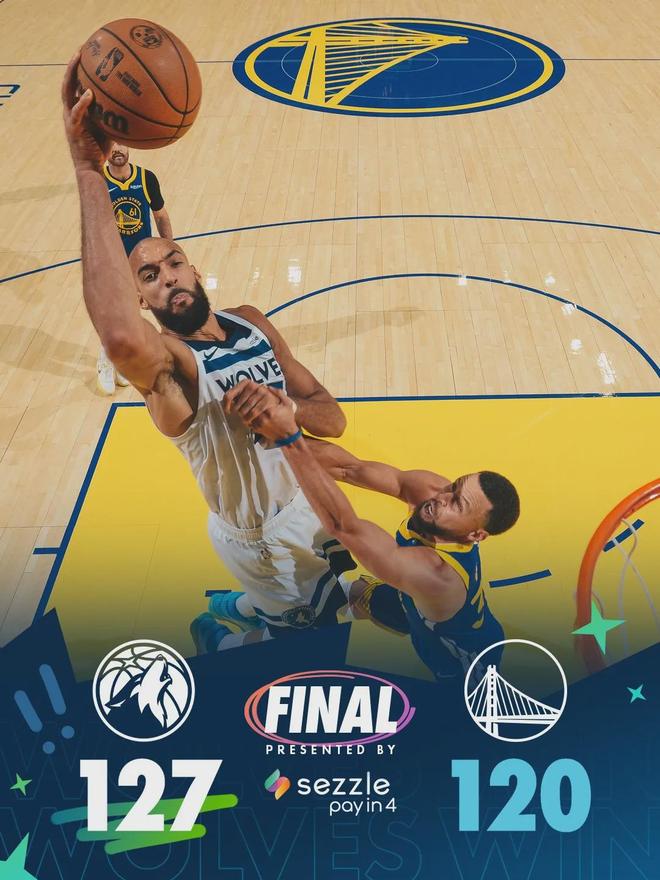 迪温琴佐大心脏表演,末节最后2分钟命中两记三分,27.4秒这记三分直接杀死勇士。全场结束,森林狼127-120战胜勇士。森林狼三人20+:兰德尔27分9板6助、戈贝尔24分14板2断、迪温岑佐21分6板4助;库里空砍39分5板5助。